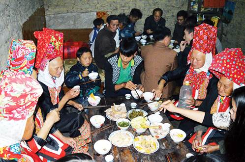 Hình 2. Đồng bào dân tộc Dao cùng quây quần bên mâm cơm, ăn uống,