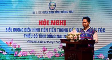 Anh K’ Tâm phát biểu tham luận tại Hội nghị biểu dương điển hình tiên tiến trong đồng bào dân tộc thiểu số tỉnh Đồng Nai năm 2025