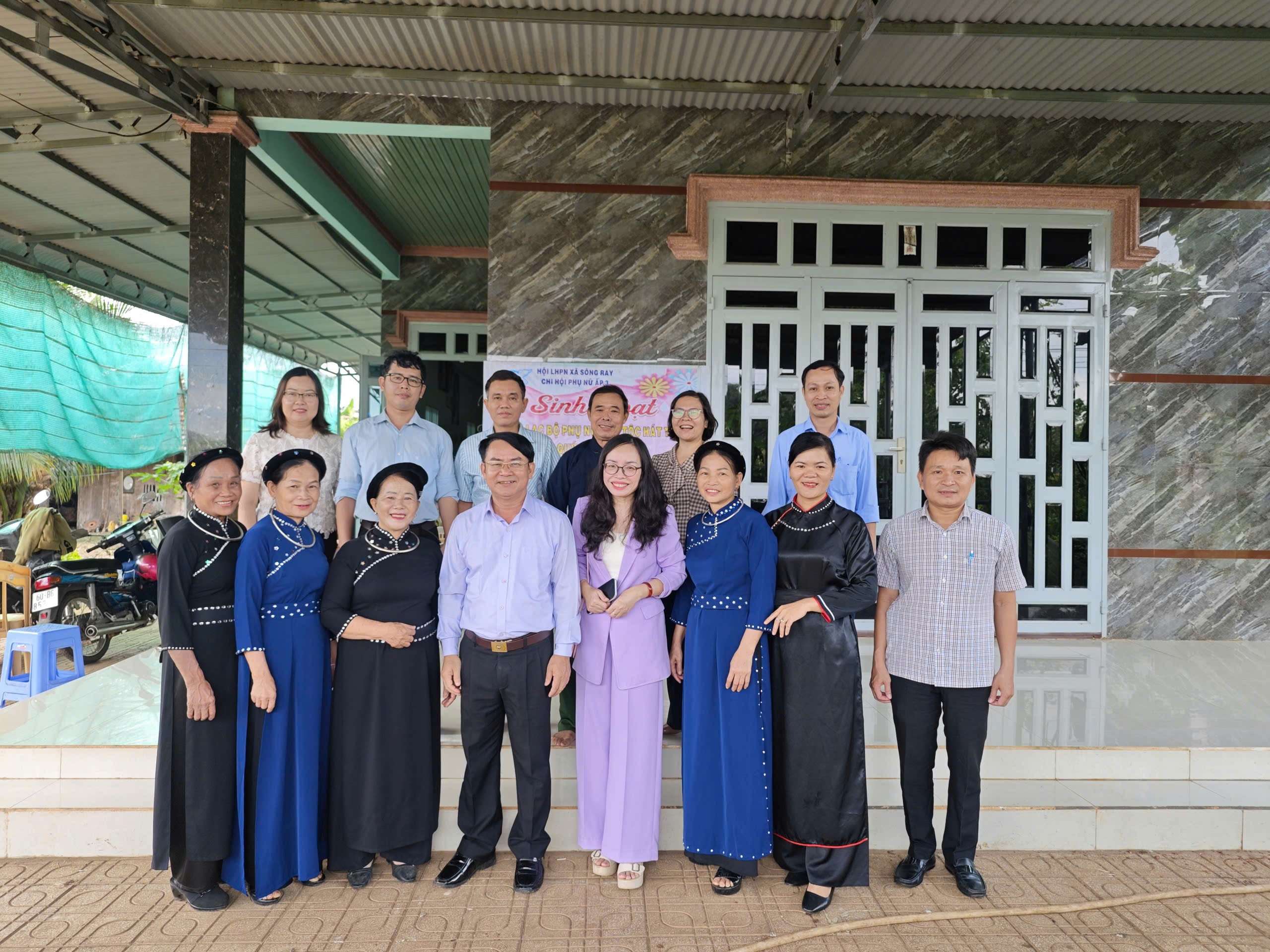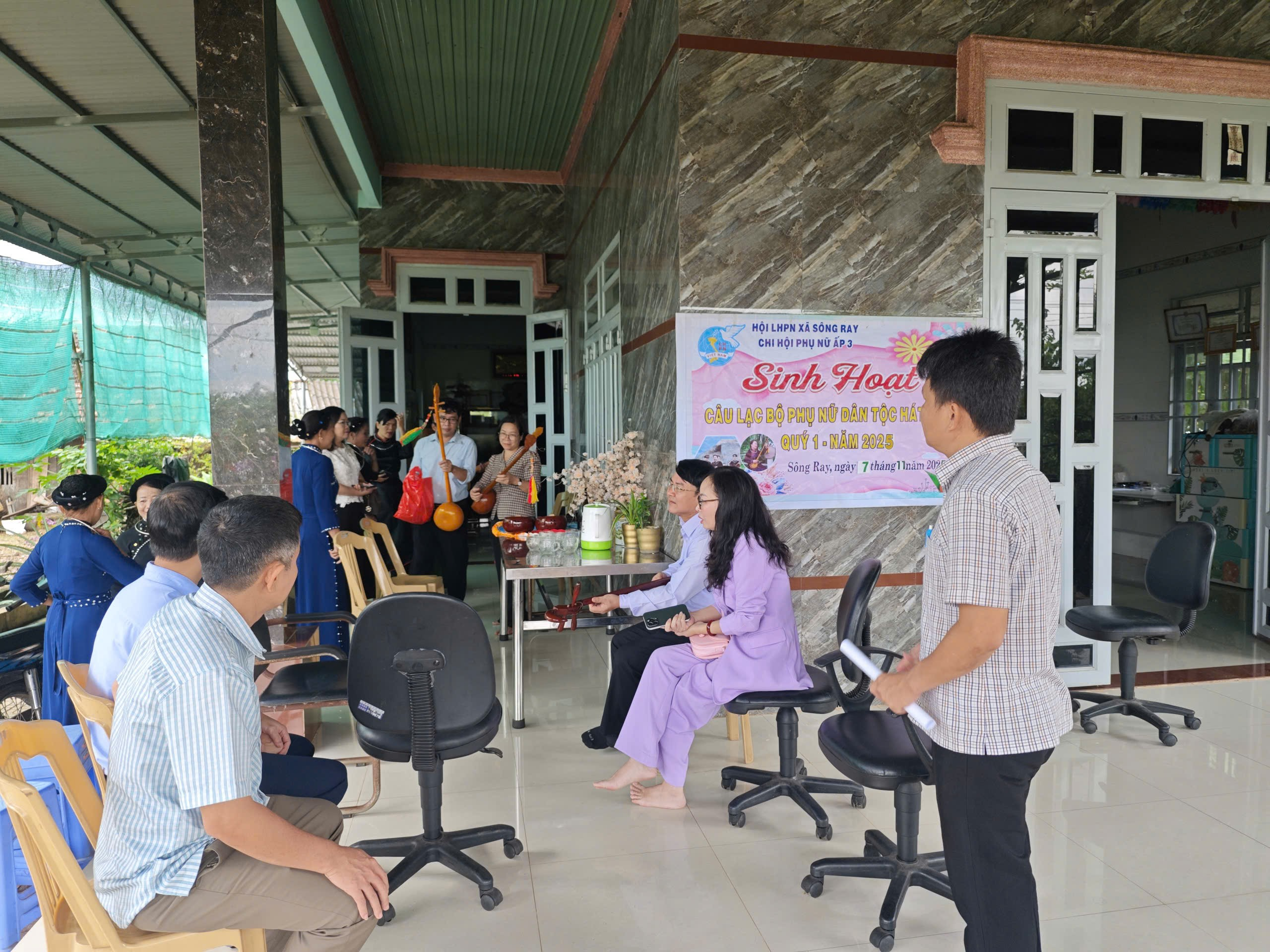 Trưởng đoàn và Lãnh đạo UBND xã Sông Ray trao đổi về hoạt động của Câu Lạc bộ và lắng nghe nguyện vọng tổ chức các lớp duy trì bản sắc truyền thống của đồng bào thiểu số Tày, Nùng.