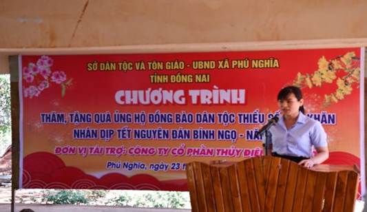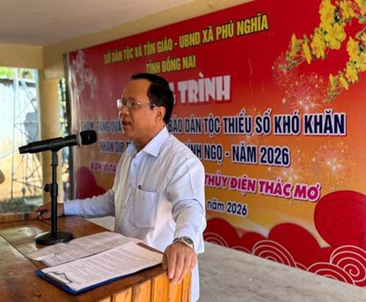 Kết thúc buổi trao quà, bà Đỗ Thị Thúy - Phó Chủ tịch UBND xã Phú Nghĩa đã trân trọng cảm ơn sự quan tâm, hỗ trợ, kết nối của Sở Dân tộc và Tôn giáo tỉnh Đồng Nai và sự đồng hành thiết thực của Công ty Cổ phần Thủy điện Thác Mơ trong việc hỗ trợ, trao tặng 100 phần quà cho các hộ đồng bào dân tộc thiểu số có hoàn cảnh khó khăn trên địa bàn xã Phú Nghĩa nhân dịp Tết Nguyên đán Bính Ngọ năm 2026. Sự quan tâm, chia sẻ và kết nối đầy nghĩa tình của Sở Dân tộc và Tôn giáo cùng các đơn vị đồng hành là nguồn động viên tinh thần quý báu, góp phần giúp các hộ đồng bào dân tộc thiểu số yên tâm ổn định cuộc sống, vươn lên thoát nghèo, đồng thời hỗ trợ chính quyền địa phương thực hiện hiệu quả công tác an sinh xã hội. Bà bày tỏ mong muốn trong thời gian tới, nhân dân xã Phú Nghĩa tiếp tục nhận được sự quan tâm, sẻ chia và đồng hành của Sở Dân tộc và Tôn giáo cùng các tổ chức, cá nhân, mạnh thường quân, góp phần chăm lo tốt hơn đời sống cho đồng bào trên địa bàn.