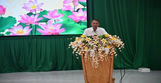 Hình 2. Phát biểu khai mạc của ông Nguyễn Văn Khang - Phó Giám đốc Sở Dân tộc và Tôn giáo và triển khai chuyên đề tại Hội nghị.