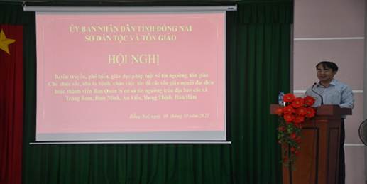 Các chuyên đề Hội nghị do các báo cáo viên cấp tỉnh: Ông Nguyễn Văn Khang - Phó Giám đốc Sở Dân tộc và Tôn giáo; ông Trần Thương Huyền, Trưởng phòng Tôn giáo - Tín ngưỡng trình bày.