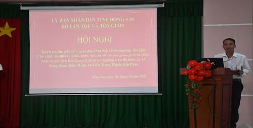 Ngày 08/10/2025, Sở Dân tộc và Tôn giáo tổ chức tuyên truyền, phổ biến, giáo dục pháp luật cho chức sắc, chức việc, nhà tu hành, tín đồ các tôn giáo, người đại diện hoặc thành viên Ban Quản lý cơ sở tín ngưỡng năm 2025 trên địa bàn các xã Trảng Bom, An Viễn, Binh Minh, Bàu Hàm, Hưng Thịnh tại Hội trường UBND xã Trảng Bom.