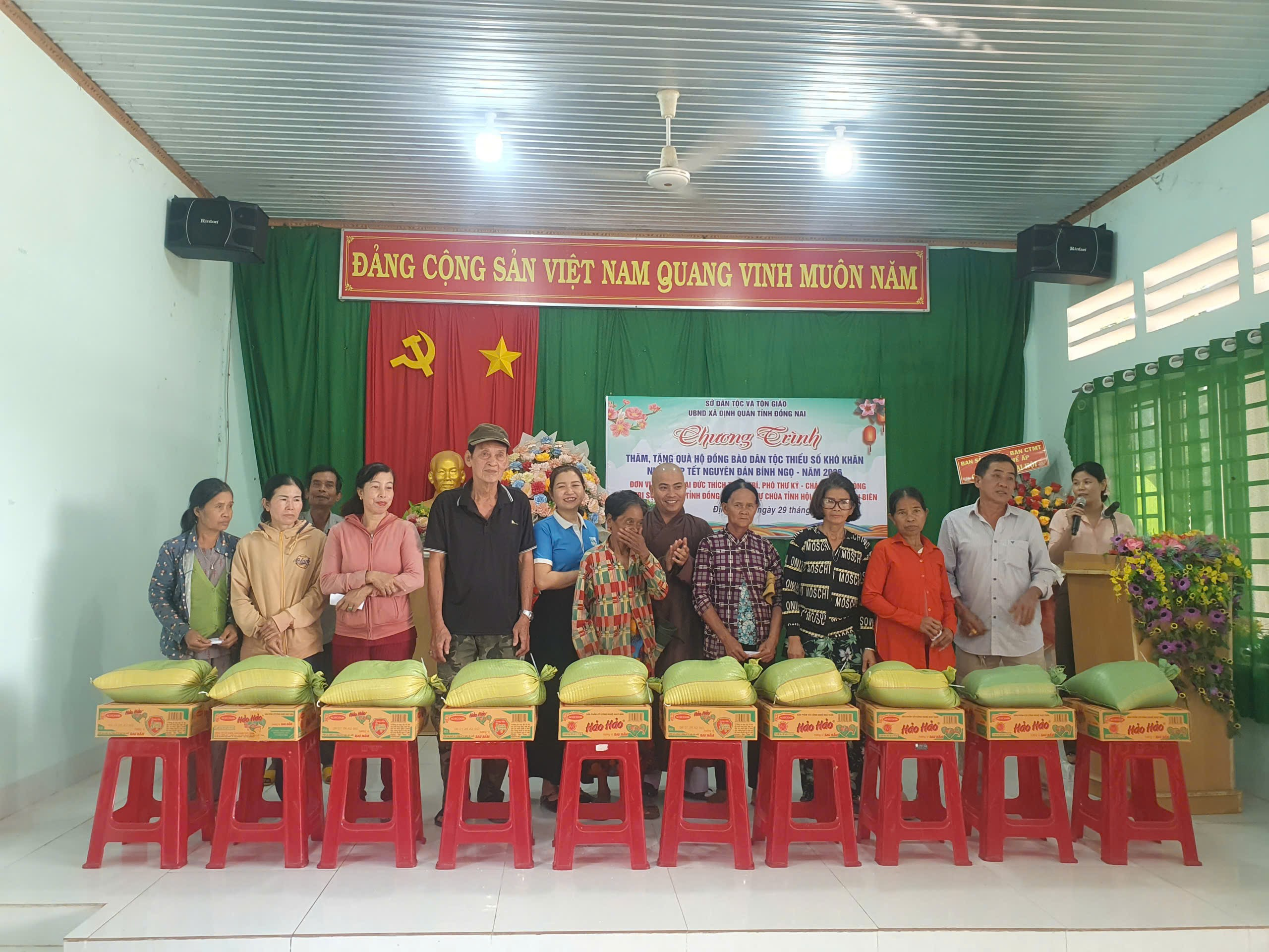 Nhân dịp Tết Nguyên đán Bính Ngọ năm 2026, với tinh thần tương thân tương ái, phát huy truyền thống tốt đẹp của dân tộc “lá lành đùm lá rách”, “ không để ai bị bỏ lại phía sau”. Sáng ngày 29/01/2026, Sở Dân tộc và Tôn giáo đã phối hợp với UBND xã Định Quán giới thiệu địa điểm để cá nhân Đại đức Thích Thiện Trí - Phó Thư ký - Chánh Văn phòng Ban Trị sự GHPG tỉnh Đồng Nai, giám tự Chùa Tỉnh hội, Phường Trấn Biên đến thăm, tặng quà cho đồng bào dân tộc thiểu số có hoàn cảnh khó khăn trên địa bàn xã Định Quán.