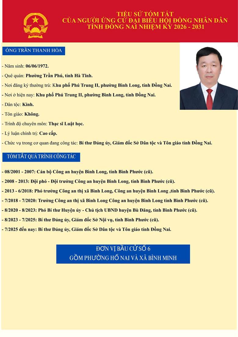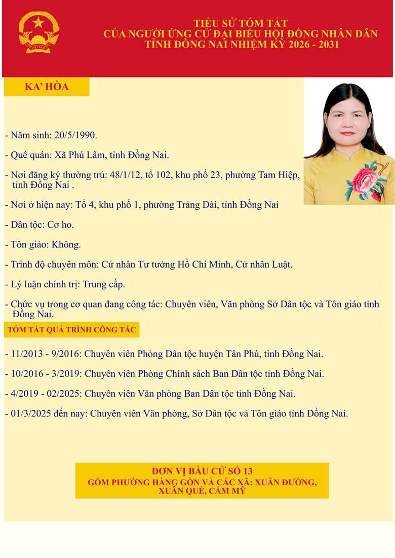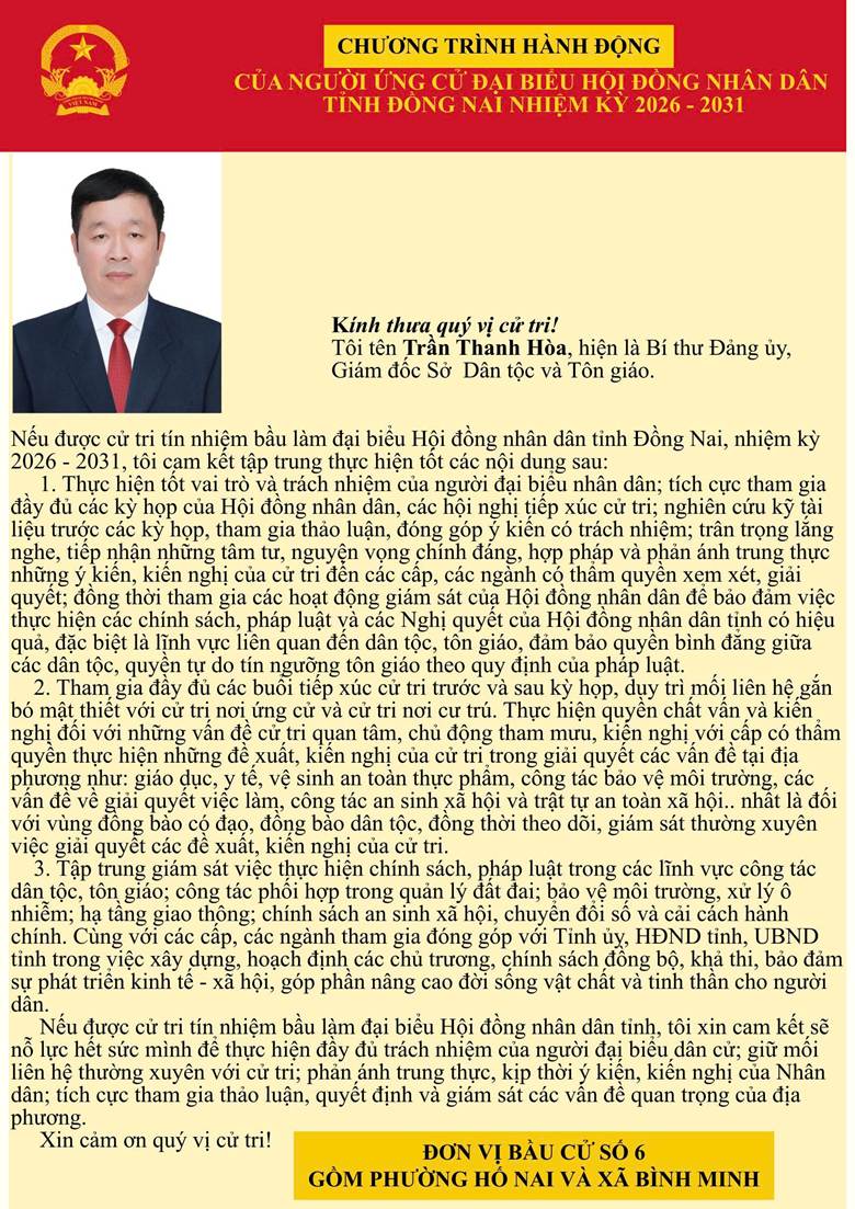 Sở Dân tộc và Tôn giáo tỉnh Đồng Nai xin trân trọng giới thiệu tiểu sử tóm tắt và Chương trình hành động của 02 Ứng cử viên đại biểu HĐND tỉnh Đồng Nai khóa XI, nhiệm kỳ 2026-2031