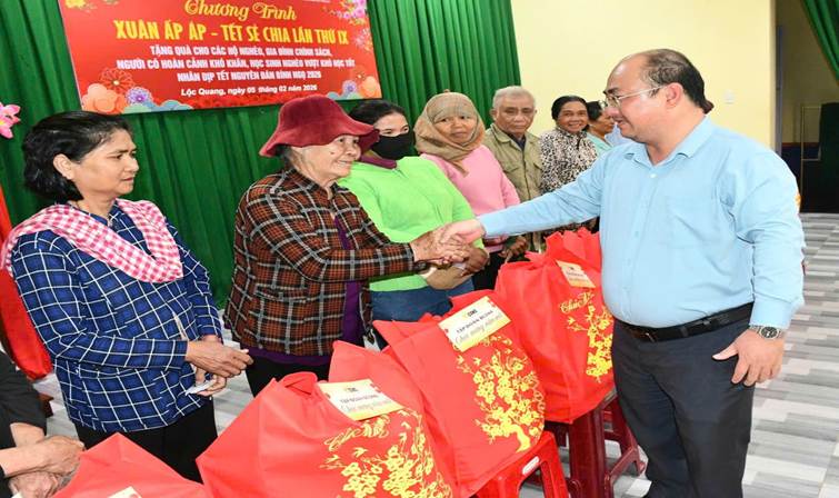 Ông Thổ Út - Phó Giám đốc Sở Dân tộc và Tôn giáo tặng quà cho đồng bào dân tộc thiểu số có hoàn cảnh khó khăn tại xã Lộc Quang nhân dịp Tết Nguyên đán Bính Ngọ năm 2026