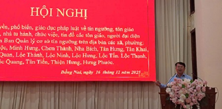 Ngày 16/12/2025, Sở Dân tộc và Tôn giáo tổ chức tuyên truyền, phổ biến, giáo dục pháp luật cho chức sắc, chức việc, nhà tu hành, tín đồ các tôn giáo, người đại diện hoặc thành viên Ban Quản lý cơ sở tín ngưỡng năm 2025 trên địa bàn các xã, phường: Bình Long, An Lộc, Minh Hưng, Chơn Thành, Nha Bích, Tân Hưng Tân Khai, Minh Đức, Tân Quan, Lộc Thành, Lộc Ninh, Lộc Hưng, Lộc Tấn, Lộc Thạnh, Lộc Quảng, Tân Tiến, Thiện Hưng, Hưng Phước tại Hội trường UBND xã Tân Khai, tỉnh Đồng Nai.