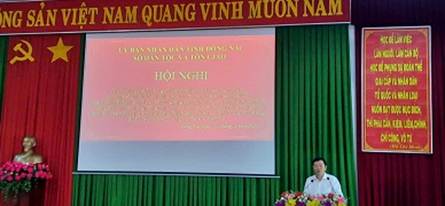 Hình 3. Ông Nguyễn Văn Khang, Phó Giám đốc Sở Dân tộc và Tôn giáo, báo cáo viên của tỉnh trình bày tại hội nghị