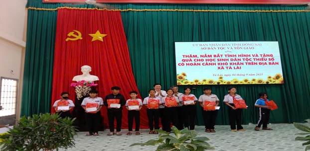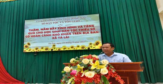 Nhằm kịp thời động viên, hỗ trợ các em học sinh dân tộc thiểu số có hoàn cảnh khó khăn trước thềm năm học mới 2025-2026. Được ủng hộ, đóng góp về của các tổ chức, cá nhân nhà tài trợ, Sở Dân tộc và Tôn giáo tỉnh Đồng Nai chủ trì, phối hợp với chính quyền địa phương tổ chức chương trình thăm, nắm tình hình vùng đồng bào dân tộc thiểu số trên địa bàn xã Tân Tiến, xã Tà Lài và trao 100 xuất quà cho học sinh dân tộc thiểu số trên địa bàn 02 xã, với tổng kinh phí thực hiện trên 50 triệu đồng.