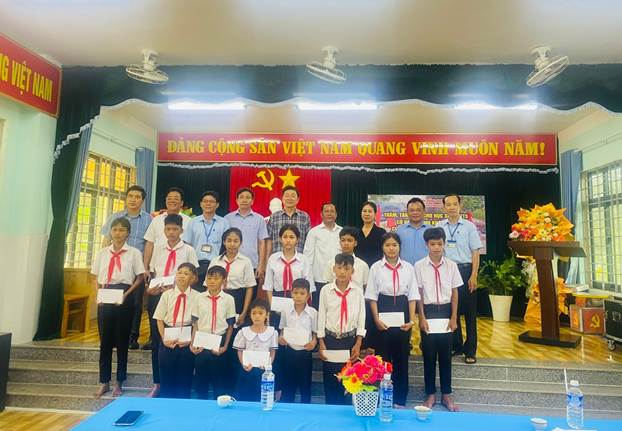 Đ/c Trần Thanh Hòa – Giám đốc Sở Dân tộc và Tôn giáo; Các Phó giám đốc và chính quyền xã Tân Tiến chụp hình lưu niệm cùng các em học sinh DTTS vào ngày 29/8