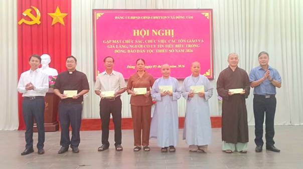 <p style="text-align:center;">&nbsp;</p><p style="text-align:center;">&nbsp;</p><p style="margin-left:0in;text-align:justify;">Nhằm ghi nhận, biểu dương và phát huy vai trò của chức sắc, chức việc các tôn giáo và già làng, người có uy tín tiêu biểu trong đồng bào dân tộc thiểu số, góp phần củng cố khối đại đoàn kết toàn dân tộc và vận động Nhân dân thực hiện tốt chủ trương của Đảng, chính sách, pháp luật của Nhà nước, sáng ngày 05/3/2026, Đảng ủy - HĐND - UBND - UBMTTQVN xã Đồng Tâm tổ chức họp mặt chức sắc, chức việc các tôn giáo và già làng, người có uy tín tiêu biểu trong đồng bào dân tộc thiểu số nhân dịp Xuân Bính Ngọ 2026.</p><p style="margin-left:0in;text-align:justify;">Dự buổi họp mặt có ông Hoàng Cư - Phó Giám đốc Sở Dân tộc và Tôn giáo; ông Đinh Văn Kỹ - Bí thư Đảng ủy, Chủ tịch Hội đồng nhân dân xã; bà Phùng Thị Cẩm Tú - Phó Bí thư Thường trực Đảng ủy xã; ông Nguyễn Thanh Phương - Ủy viên Ban Thường vụ Đảng ủy, Chủ tịch UBND xã; bà Nguyễn Thị Vân Anh - Ủy viên Ban Thường vụ Đảng ủy, Chủ tịch Ủy ban MTTQ Việt Nam xã; cùng lãnh đạo các ban, ngành của xã và 31 vị chức sắc, chức việc các tôn giáo, già làng, người có uy tín tiêu biểu trong đồng bào dân tộc thiểu số trên địa bàn xã Đồng Tâm.</p><p style="margin-left:0in;text-align:center;"><img src="https://sdttg.dongnai.gov.vn/uploads/sdttg/news/2026_03/image_5.jpeg" width="566" height="324" /></p><p style="margin-left:0in;text-align:center;"><strong>Toàn cảnh buổi họp mặt</strong></p><p style="margin-left:0in;text-align:justify;">Phát biểu chào mừng tại buổi họp mặt, ông Đinh Văn Kỹ - Bí thư Đảng ủy, Chủ tịch Hội đồng nhân dân xã ghi nhận và biểu dương những đóng góp tích cực của chức sắc, chức việc các tôn giáo, già làng và người có uy tín trong việc phối hợp với chính quyền, Mặt trận Tổ quốc và các đoàn thể địa phương thực hiện tốt công tác an sinh xã hội, tuyên truyền, vận động Nhân dân chấp hành chủ trương của Đảng, chính sách, pháp luật của Nhà nước; góp phần giữ vững an ninh chính trị, trật tự an toàn xã hội và thúc đẩy phát triển kinh tế - xã hội tại địa phương. Đồng chí mong muốn thời gian tới, chức sắc, chức việc các tôn giáo và già làng, người có uy tín tiếp tục phát huy vai trò, uy tín của mình; tích cực phối hợp với chính quyền địa phương củng cố khối đại đoàn kết toàn dân tộc, tham gia các phong trào thi đua yêu nước, xây dựng đời sống văn hóa ở khu dân cư; đồng thời tuyên truyền, vận động cử tri tham gia bầu cử ngày 15/3/2026, bảo đảm dân chủ, đúng quy định, an toàn, để ngày bầu cử thực sự trở thành ngày hội của toàn dân.</p><p style="margin-left:0in;text-align:justify;">&nbsp;</p><p style="margin-left:0in;text-align:center;"><img src="https://sdttg.dongnai.gov.vn/uploads/sdttg/news/2026_03/image_7.jpeg" width="605" height="339" /></p><p style="margin-left:0in;text-align:center;"><strong>Ông Đinh Văn Kỹ - Bí thư Đảng ủy, Chủ tịch Hội đồng nhân dân xã phát biểu chào mừng tại buổi họp mặt</strong></p><p style="margin-left:0in;text-align:justify;">Tại buổi họp mặt, lãnh đạo xã đã thông tin đến các đại biểu những kết quả nổi bật về tình hình phát triển kinh tế - xã hội, quốc phòng - an ninh của địa phương năm 2025 và nhiệm vụ trọng tâm năm 2026; kết quả công tác tuyên truyền, vận động Nhân dân, đồng bào dân tộc và các tôn giáo tham gia các phong trào thi đua yêu nước do Mặt trận Tổ quốc phát động; đồng thời lắng nghe ý kiến chia sẻ, kiến nghị của các chức sắc tôn giáo và già làng, người có uy tín.</p><p style="margin-left:0in;text-align:justify;">&nbsp;</p><p style="margin-left:0in;text-align:center;"><img src="https://sdttg.dongnai.gov.vn/uploads/sdttg/news/2026_03/image_8.jpeg" width="604" height="278" /></p><p style="margin-left:0in;text-align:center;"><strong>Đại biểu chức sắc tôn giáo phát biểu tại buổi họp mặt</strong></p><p style="margin-left:0in;text-align:center;">&nbsp;</p><p style="margin-left:0in;text-align:center;"><strong><img src="https://sdttg.dongnai.gov.vn/uploads/sdttg/news/2026_03/image_10.jpeg" width="604" height="409" /></strong></p><p style="margin-left:0in;text-align:center;"><strong><img src="https://sdttg.dongnai.gov.vn/uploads/sdttg/news/2026_03/image_9.jpeg" width="605" height="364" /></strong></p><p style="margin-left:0in;text-align:center;"><strong>Đại biểu già làng và người có uy tín phát biểu tại buổi họp mặt</strong></p><p style="margin-left:0in;text-align:justify;">Phát biểu tại buổi họp mặt, ông Hoàng Cư - Phó Giám đốc Sở Dân tộc và Tôn giáo đã thông tin đến các đại biểu về tình hình của tỉnh Đồng Nai sau khi thực hiện sắp xếp tổ chức bộ máy và triển khai mô hình chính quyền địa phương hai cấp; đồng thời, khái quát kết quả phát triển kinh tế - xã hội của tỉnh năm 2025, tình hình hoạt động của các tôn giáo trên địa bàn cũng như các chính sách đối với già làng, người có uy tín trong đồng bào dân tộc thiểu số.&nbsp;</p><p style="margin-left:0in;text-align:justify;">Nhân dịp này, ông cũng thông tin đến các đại biểu về cuộc bầu 
