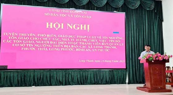 Ngày 24/9/2025, Sở Dân tộc và Tôn giáo tổ chức tuyên truyền, phổ biến, giáo dục pháp luật cho chức sắc, chức việc, nhà tu hành, tín đồ các tôn giáo, người đại diện hoặc thành viên Ban Quản lý cơ sở tín ngưỡng năm 2025 trên địa bàn các xã Long Thành, Phước Thái, Long Phước, Bình An, An Phước tại Hội trường UBND xã Long Thành.