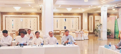 Hình 4: Linh mục Trần Xuân Thảo - Phó Chủ tịch Ủy ban Đoàn kết Công giáo Việt Nam, Chủ tịch Ủy ban Đoàn kết Công giáo Việt Nam tỉnh trao đổi tại buổi họp mặt