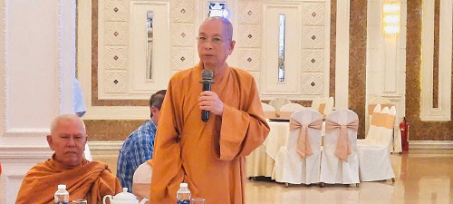 Hình 5: Thượng tọa Thích Huệ Khai - Ủy viên Thường trực Hội đồng Trị sự GHPGVN, Trưởng ban Ban Trị sự, Trưởng ban Ban Tăng sự GHPGVN tỉnh trao đổi tại buổi họp mặt
